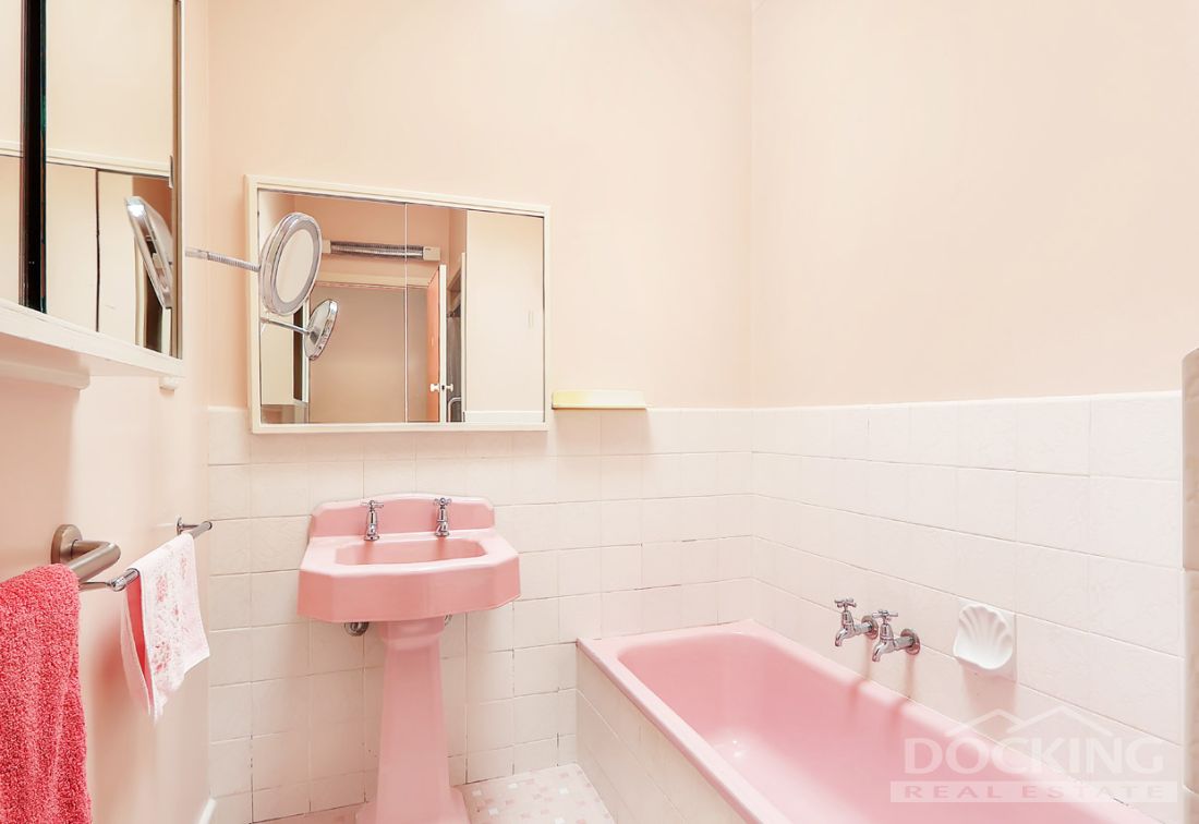 The ‘50s design showcases picture windows, frosted glass light pendants and a pink bathroom with a pedestal basin. There’s a built in bar worthy of ‘Mad Men’ cocktail hour, a retro kitchen with a breakfast bar and serving window, and a huge rumpus entertaining room with a study/hobby room which was added in the 70s.